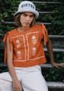 The Tiny Big Sister Embroidered Top in summer red is crafted from crisp cotton poplin and features a square, boxy cropped shape with a rounded neckline. Ties at the shoulders and contrasting white floral embroidery add a playful, folksy touch, making it a standout piece designed in Barcelona.