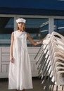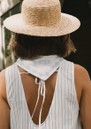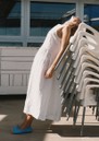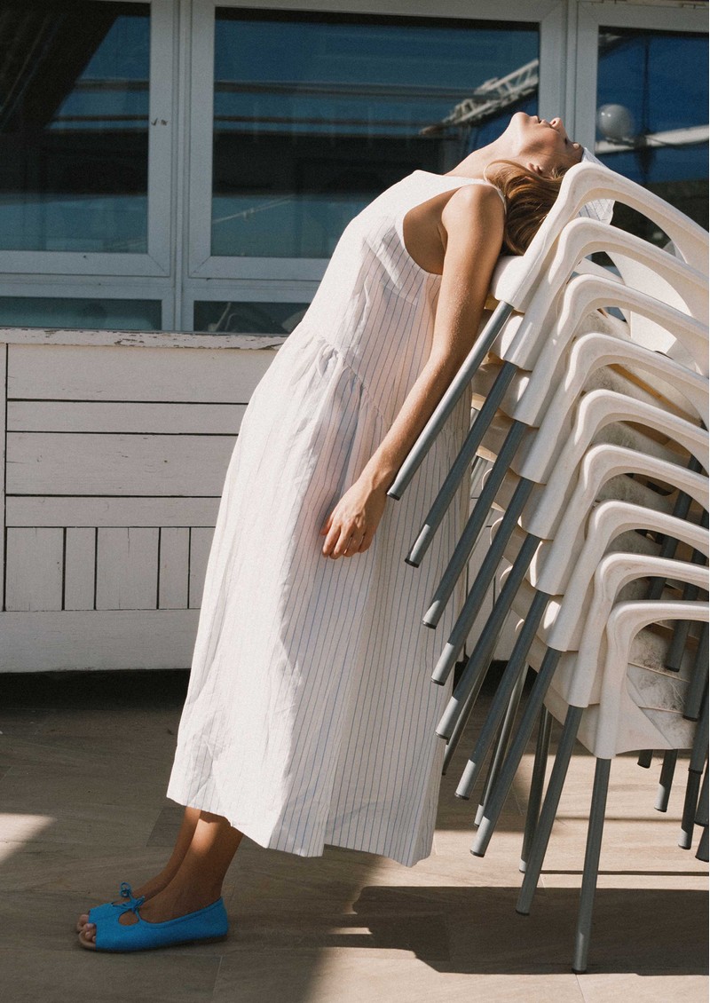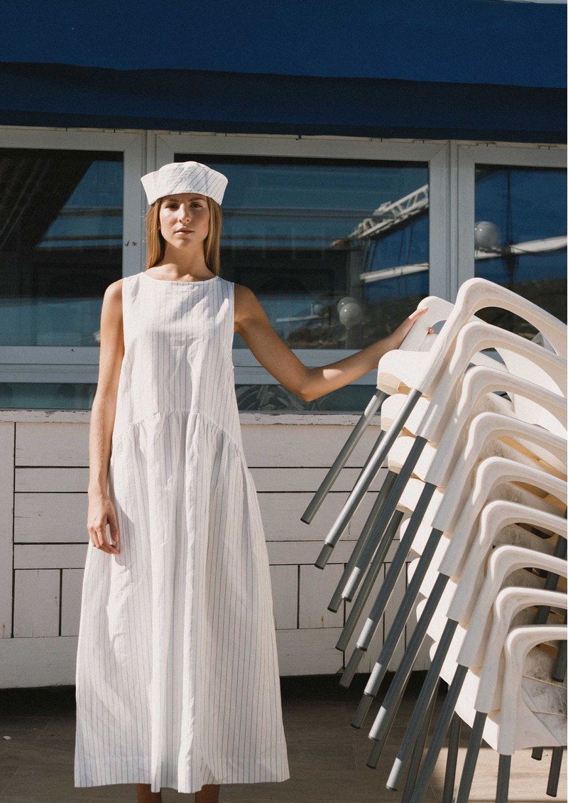 The Tiny Big Sister Low Back Striped Dress in white is crafted from soft cotton poplin, featuring a relaxed, sleeveless shape with a crew neckline and curved waistline. The dress showcases a delicate thin stripe pattern, a midaxi length, and a scoop back finished with a slender tie at the nape of the neck for a subtle, elegant detail.
