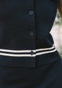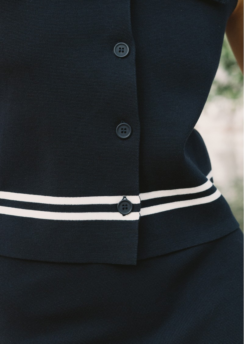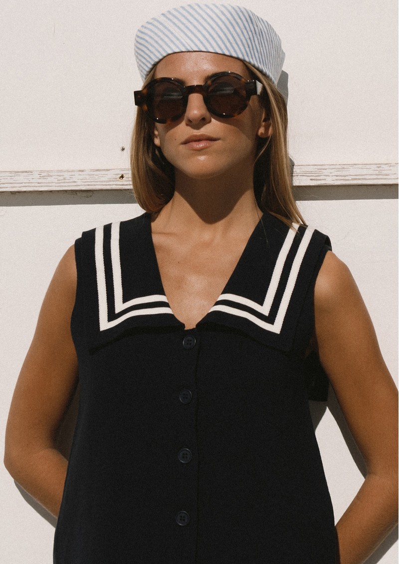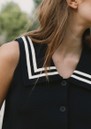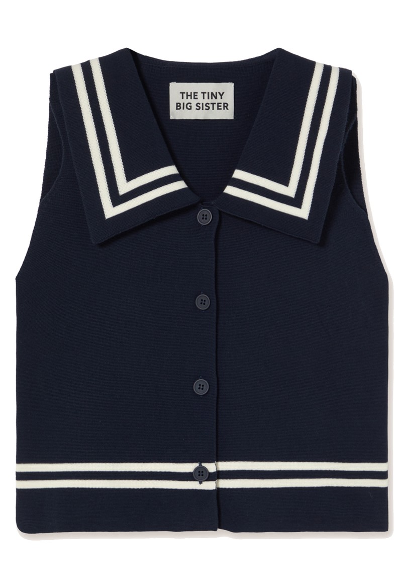 Introducing The Tiny Big Sister Sailor Vest, designed in a navy blue cotton and finished with an oversized, squared collar and contrasting white stripe detailing. Other features include: