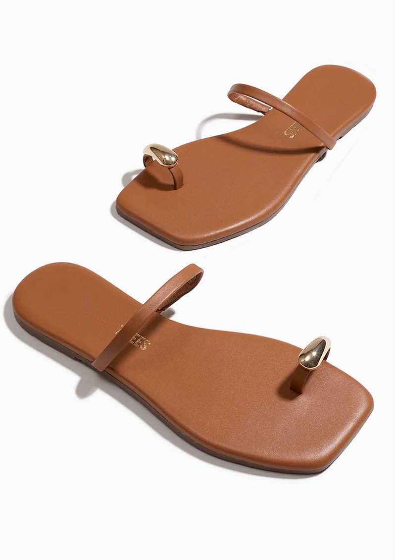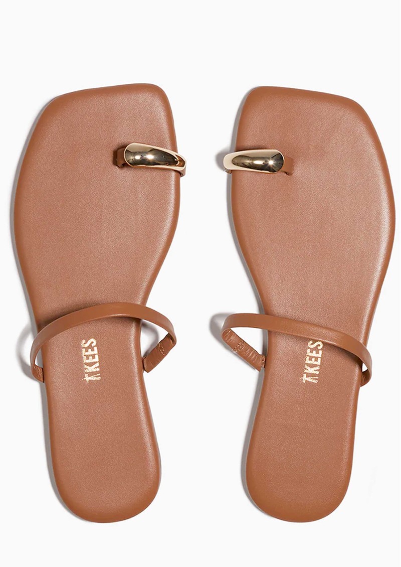 Introducing the Tkees Colette flip flop in Au Natural, a refined take on effortless glam with a sleek square toe silhouette, delicate straps, and signature gold toe hardware for a polished finish. Handcrafted in Brazil from a soft leather upper with a smooth leather insole, it offers cushioned comfort and a durable rubber outsole designed for elevated everyday wear.