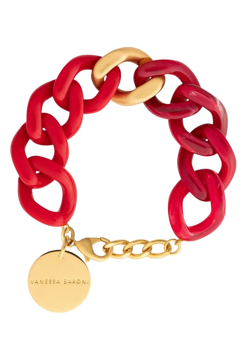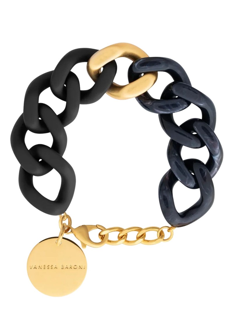 Say hello to the Vanessa Baroni Flat Chain Bracelet! This best-selling style is back for the new season in a gorgeous Black Universe colourway, featuring a single gold link, with half matte and half marble links. Made in Italy this standout piece crafted from feather-light acetate nestles gently around the wrist for a comfortable fit.