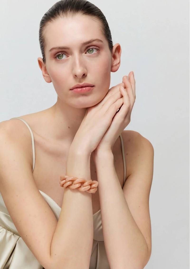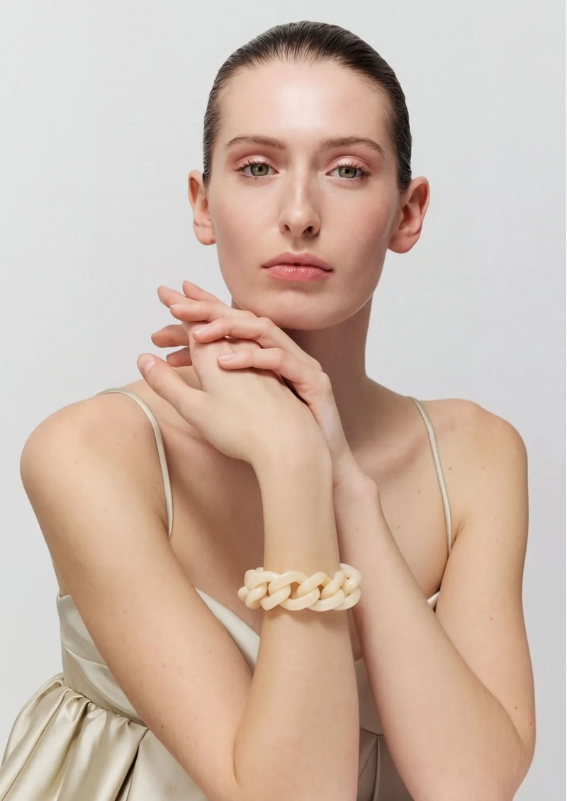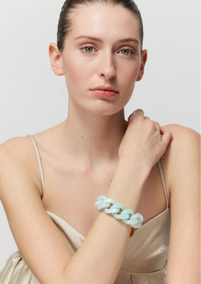 Make a bold statement with this Vanessa Baroni Great bracelet- an oversized flat chain bracelet in cloud marble, designed with striking acetate links that feel surprisingly lightweight on the wrist. Finished with gold-plated brass details and an adjustable fit, it’s the perfect standout piece to elevate any look with ease.