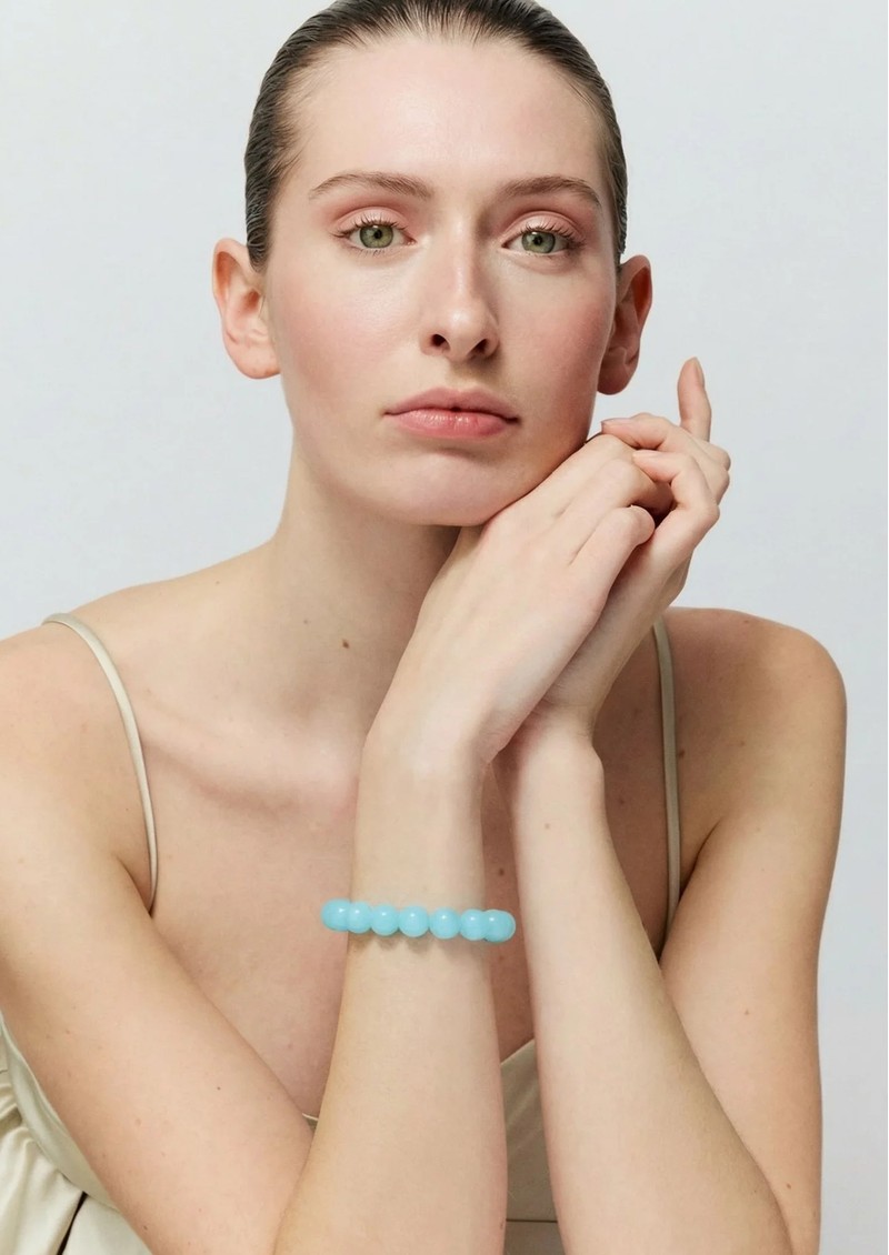 The Vanessa Baroni Mini Beads Flex Bracelet in opaline blue brings a soft, luminous pop of colour with a polished marbled finish and contemporary mini-bead design. Its flexible stretch construction makes it effortless to slip on, while its lightweight feel and refined shine make it perfect for stacking or wearing as a subtle statement on its own.