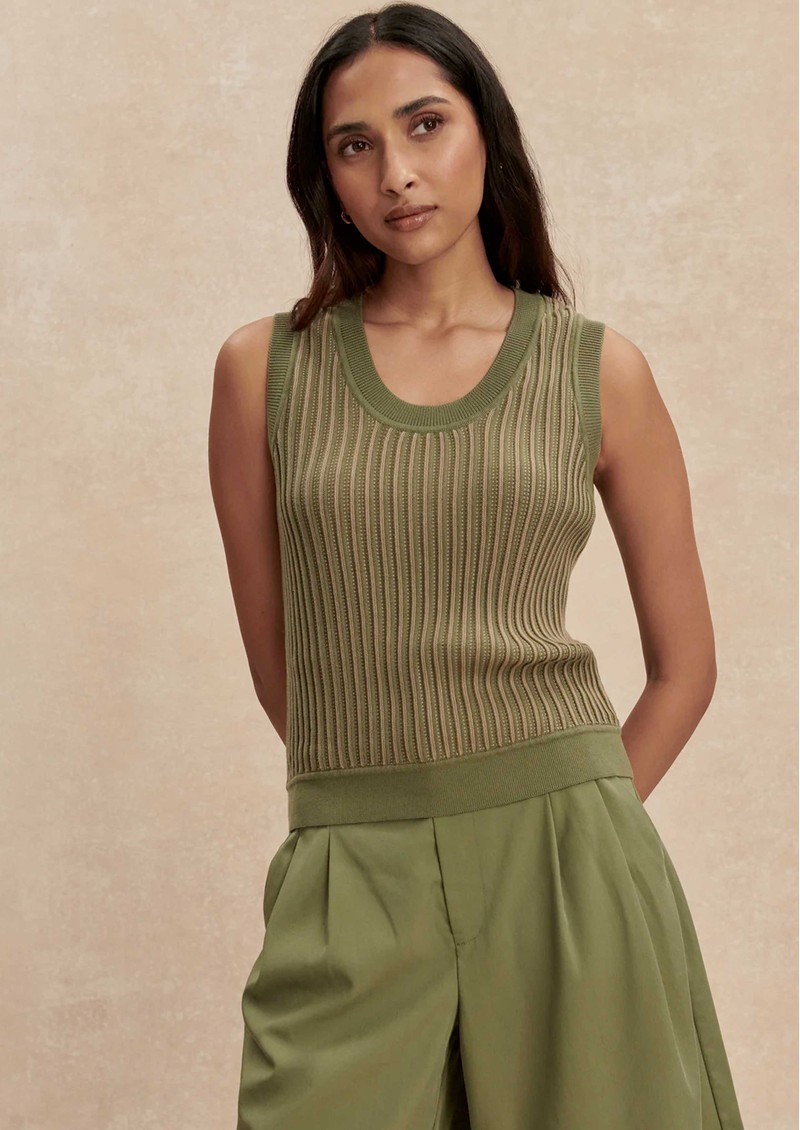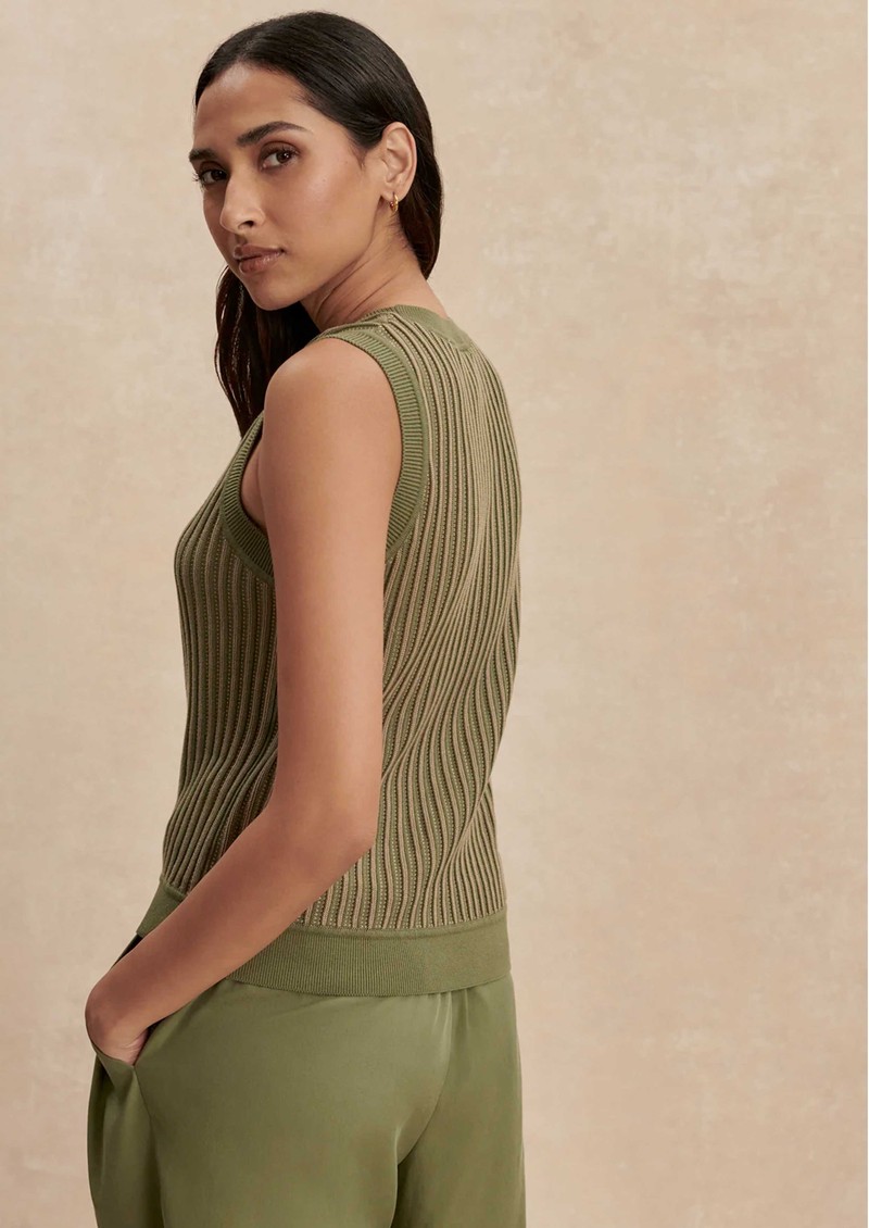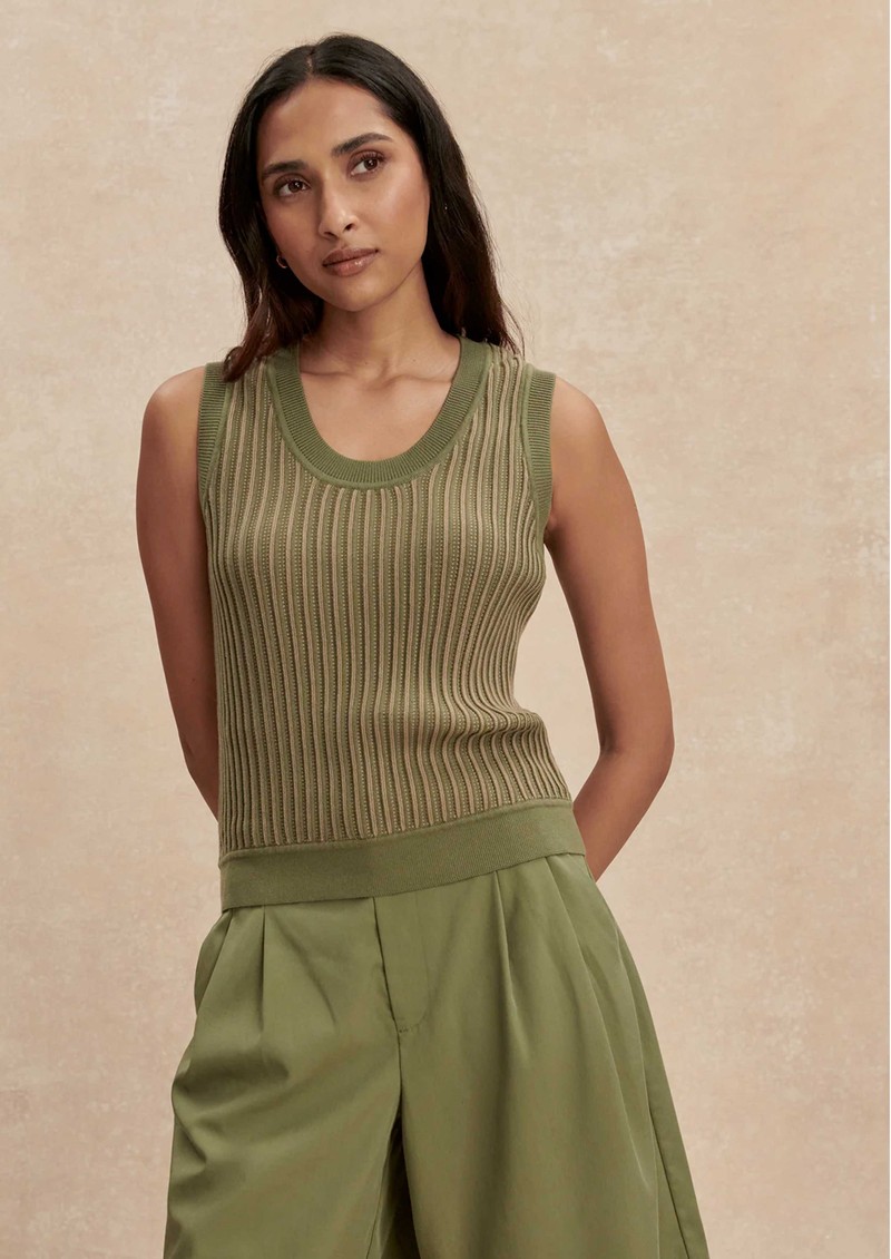 Meet the Varley Aldcroft stitch tank in olivine - a versatile cotton knit designed for effortless layering or wearing solo on warmer days. Crafted from 100% cotton, this fitted tank features a twisted pointelle knit, contrast trims, and a sleek scoop neckline for a clean, modern finish.