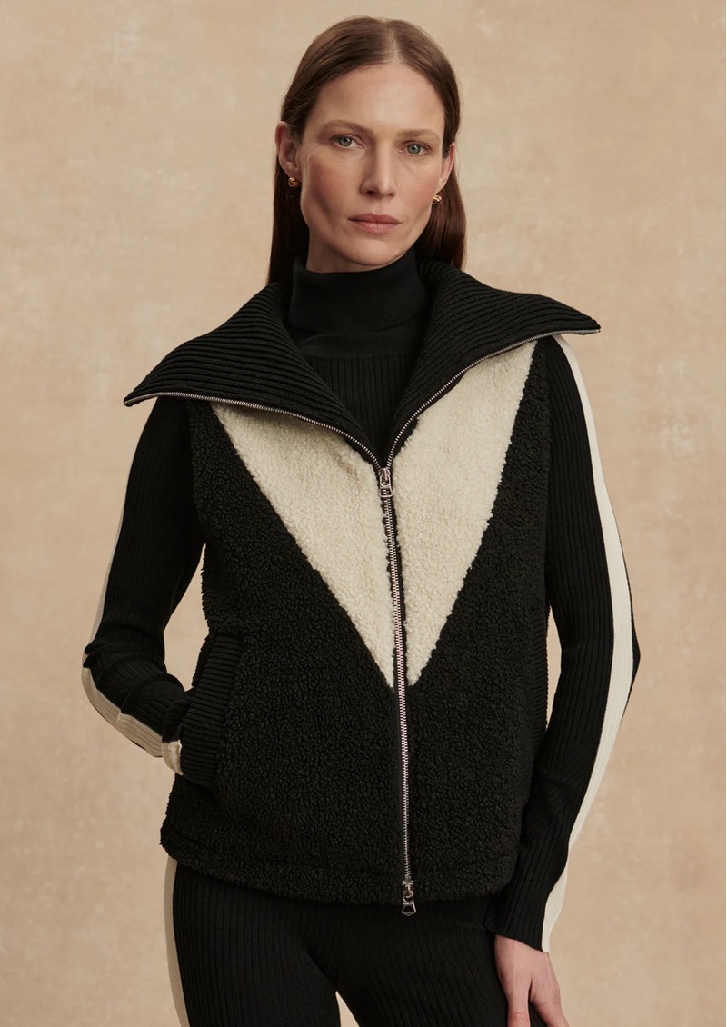 Wrap yourself in the Varley Caspian Sherpa Gilet in Black, crafted from plush bouclé sherpa with bold contrast detailing for a modern, elevated layer. With its oversized knitted collar, cosy trims, and effortless throw-on style, it brings warmth, texture, and polish to any outfit.
