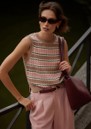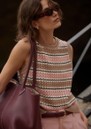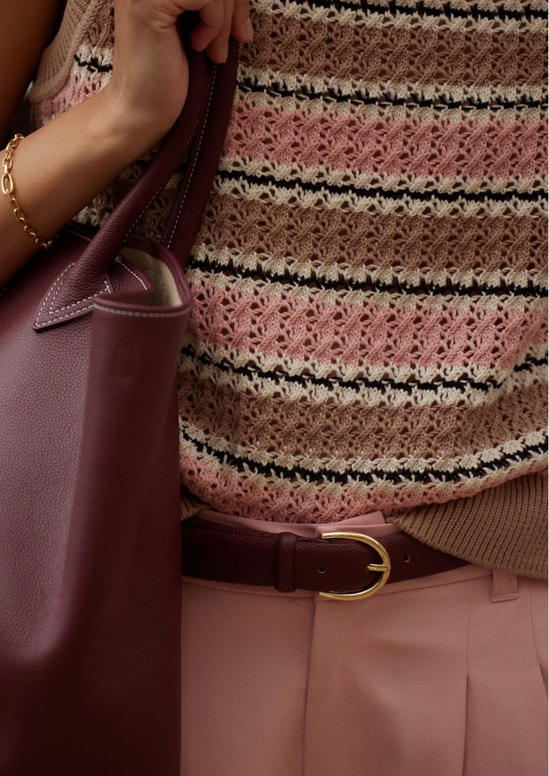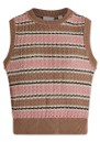 The Varley Deeley Stripe Sleeveless Top in taupe/rose is a stylish knitted tank that combines bold horizontal stripes with a delicate twisted pointelle stitch. Made from 100% cotton, it features a crew neckline, ribbed edges, side splits, and a standard fit for effortless layering or wearing solo.