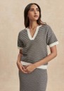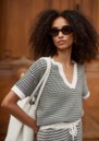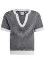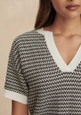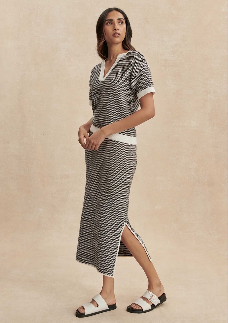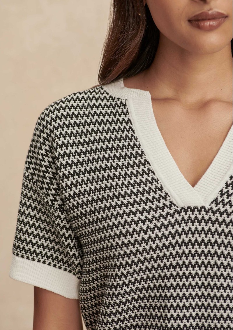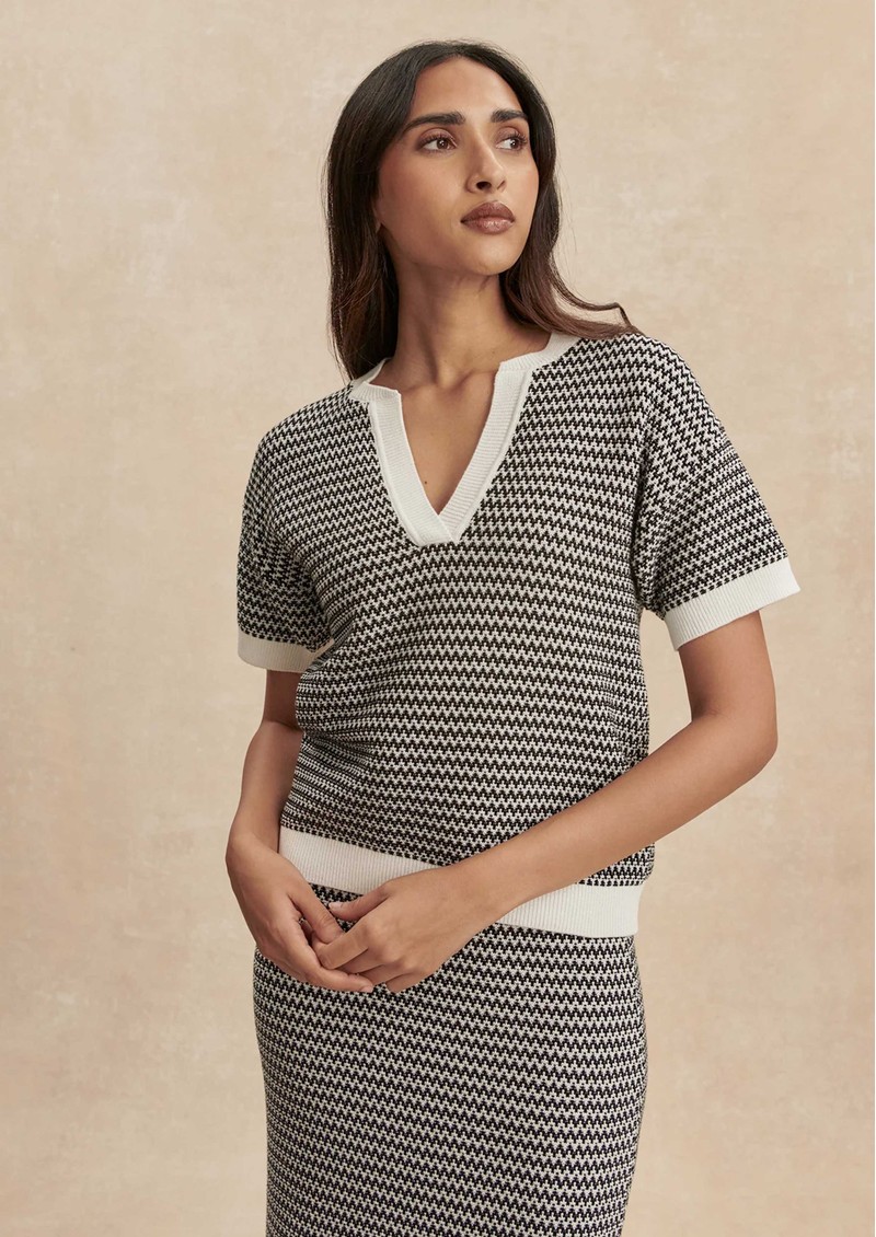 Discover the Varley Dora knit top in white/black - a refined update on a signature style, designed for effortless transitional dressing and warmer days. Crafted in a lighter knit with an improved fit, it features a soft open V-neckline, bold monochrome zig-zag pattern, and crisp white ribbed trims for a clean, modern finish.