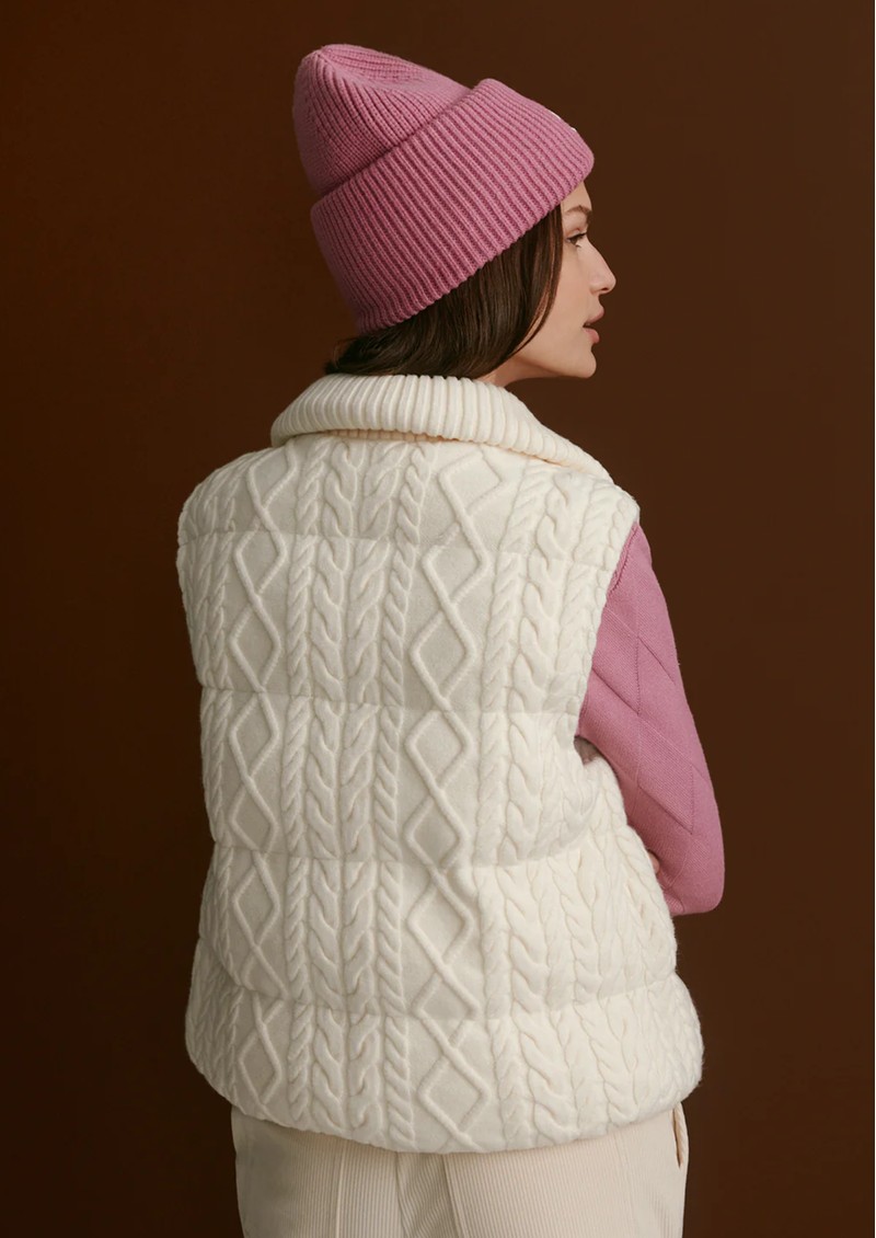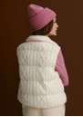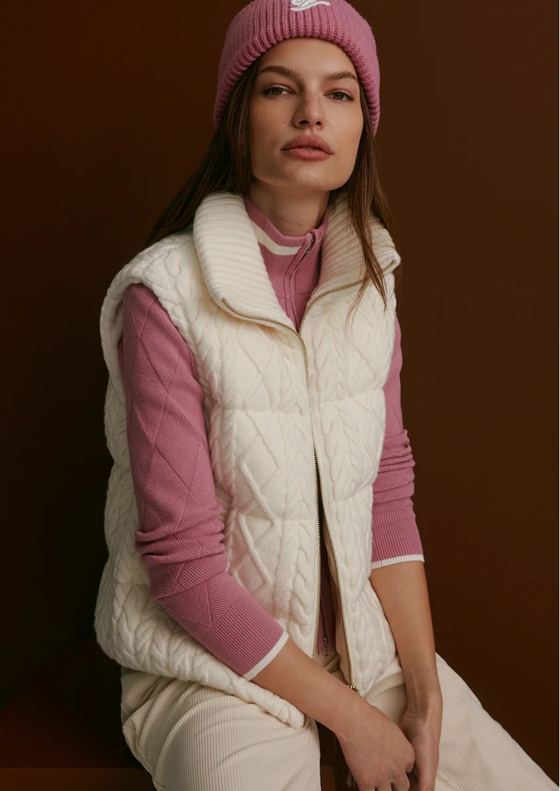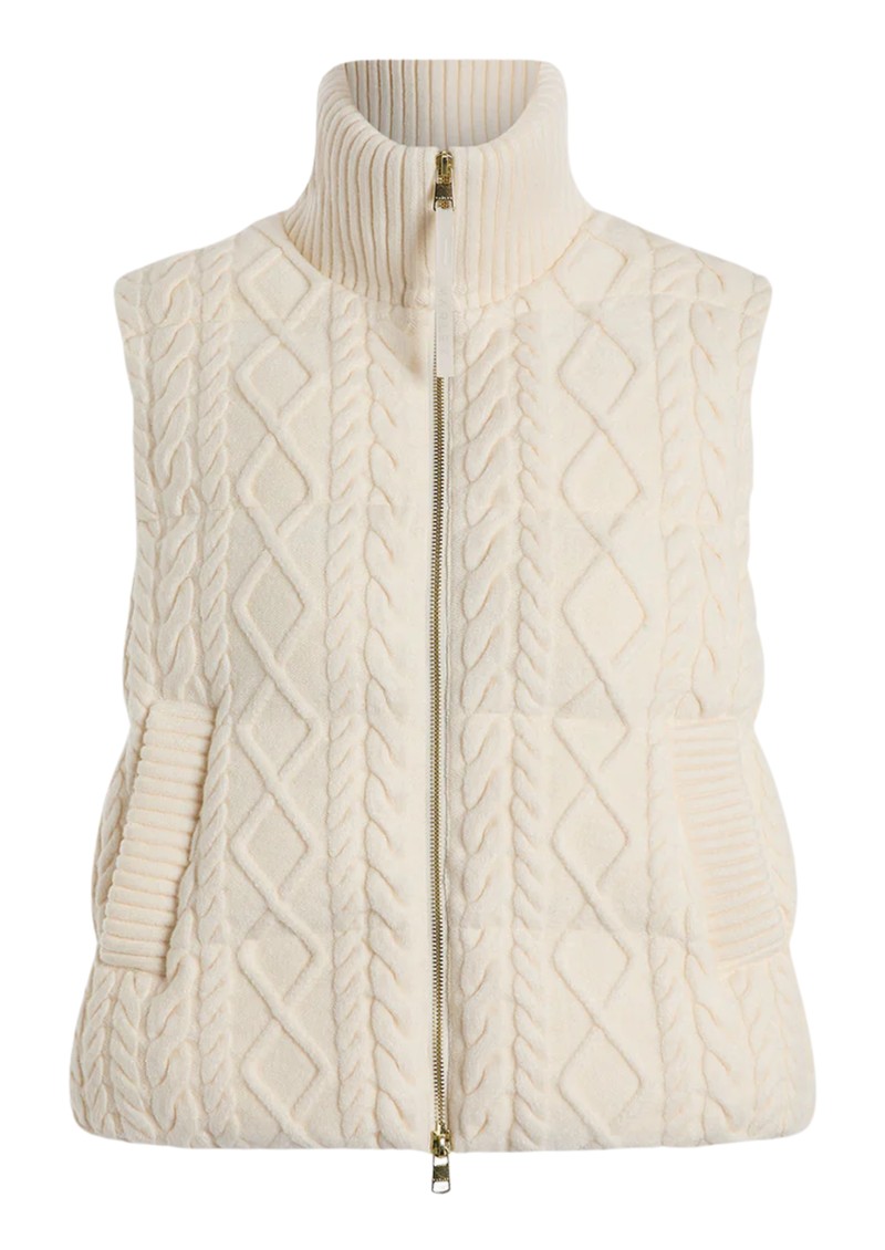 The Varley Irina Cable Knit Gilet in Egret brings a cosy, contemporary edge to your layering. Padded with DuPont Sorona® fill for warmth, it features classic cable-knit detailing, a chunky ribbed collar, practical pockets, and a double-ended zip, all in a standard-fit silhouette.
