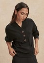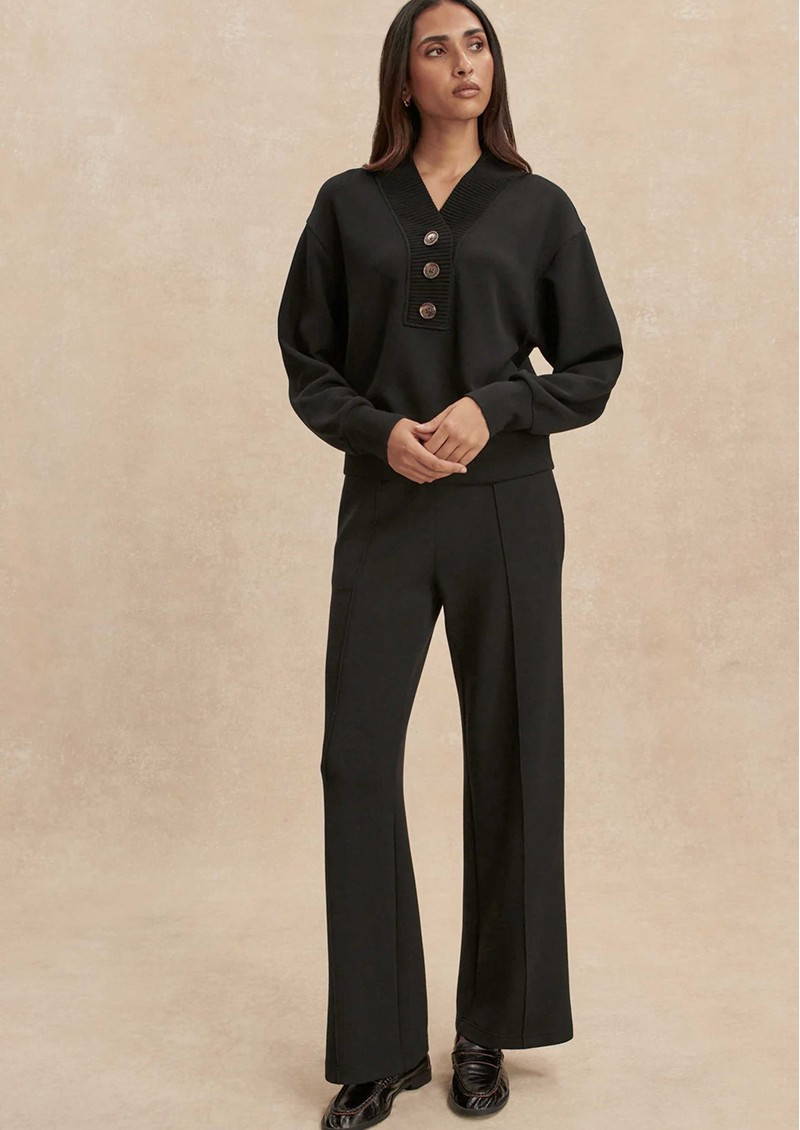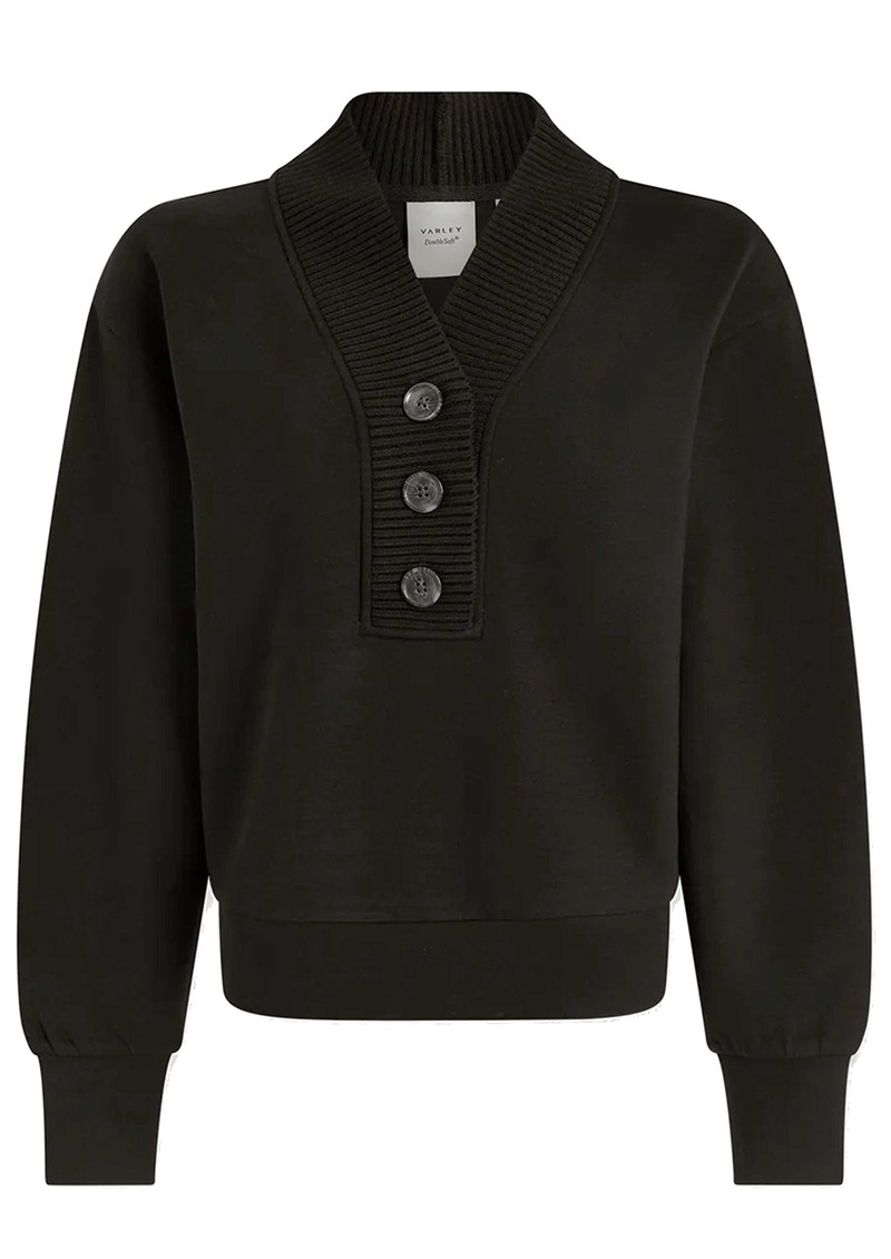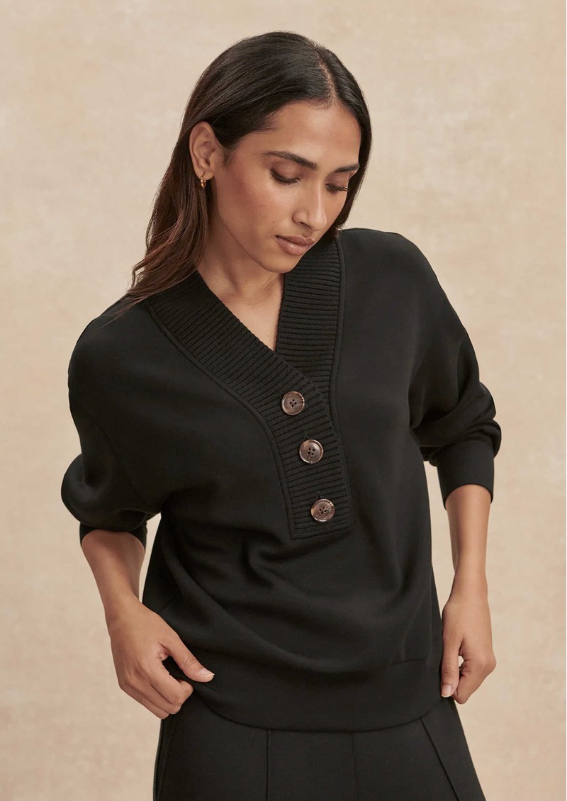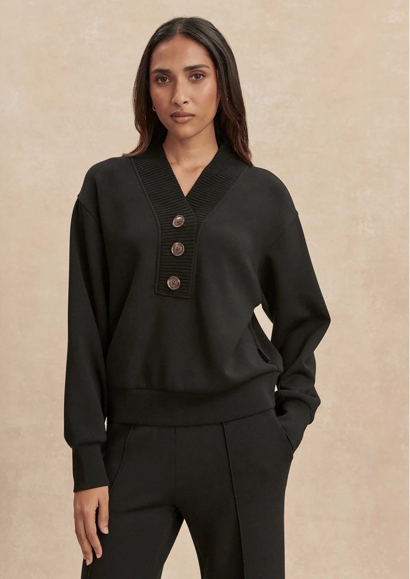 Upgrade your off-duty wardrobe with the Varley Lucine Button-Front Sweat in Black, featuring a relaxed, dropped-shoulder fit and a wide V-neckline. Crafted from soft DoubleSoft® fabric with chunky ribbed edges and a statement button placket, it’s the perfect mix of comfort and style.