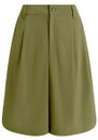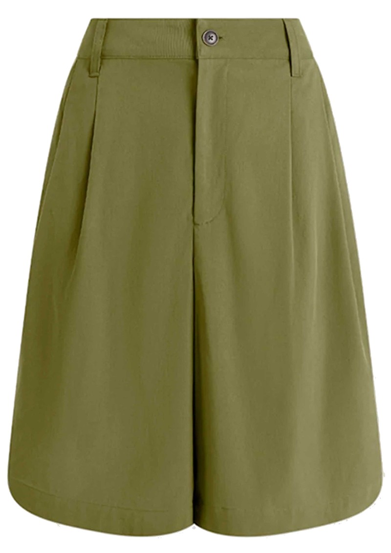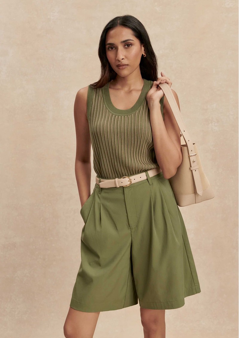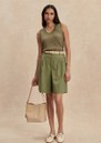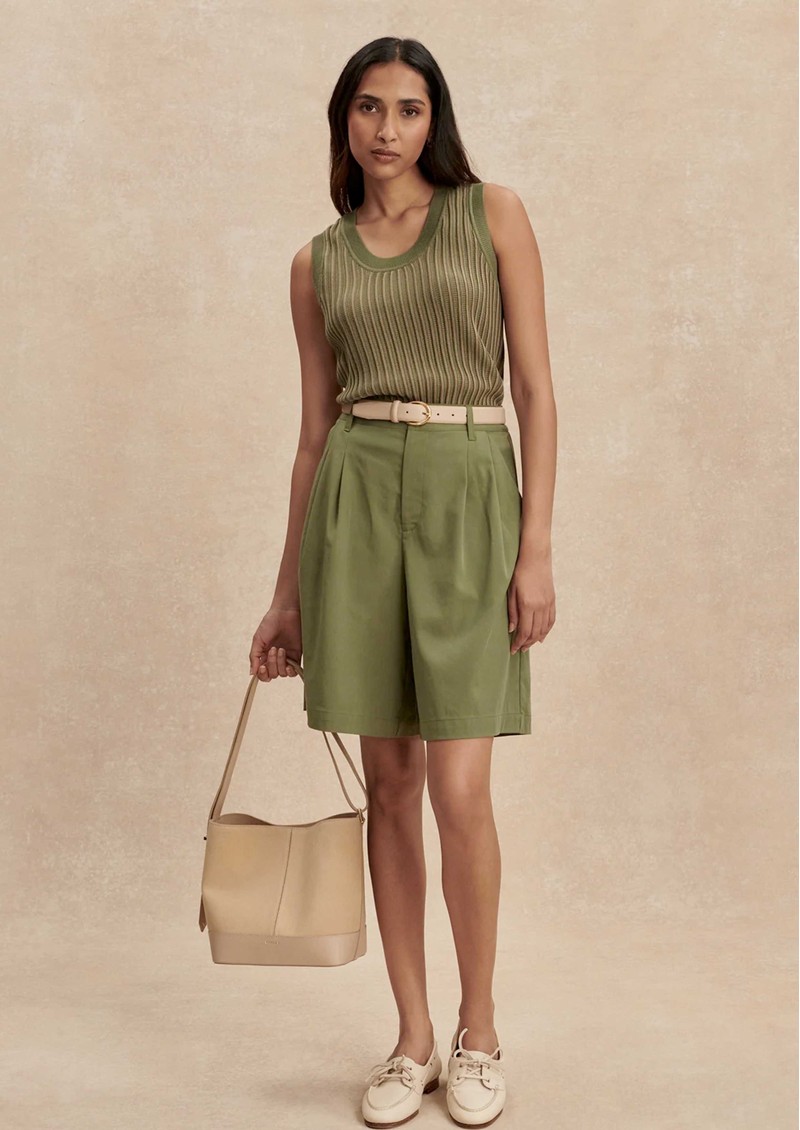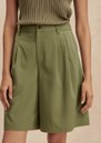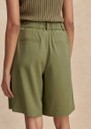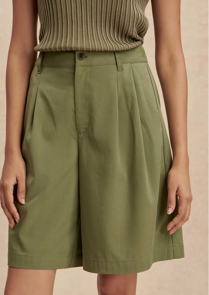 Discover the Varley Phelan long shorts in olivine - a sleek, versatile staple designed for effortless day-to-night styling. Crafted from a stretch woven fabric with a longer 8" length, they bring a modern, slightly edgy feel, while subtle front pleats and belt loops add a refined nod to classic tailoring.