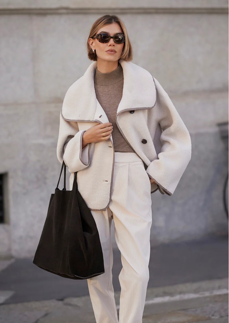 The Varley Romane Boxy Sherpa Jacket blends modern sophistication with cosy comfort, crafted from luxurious bonded fleece. Featuring a button-front, oversized collar, contrast binding, and knitted pockets, its relaxed, boxy silhouette makes layering effortless and stylish.