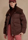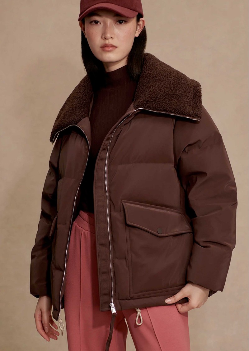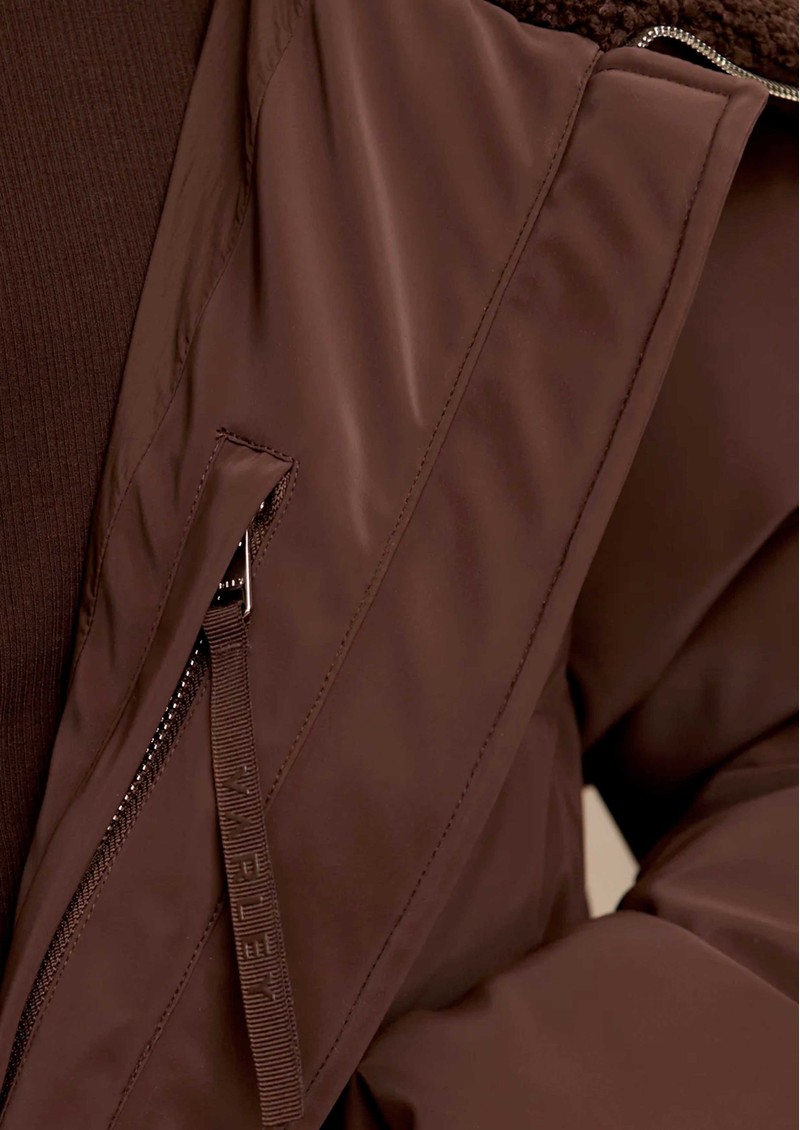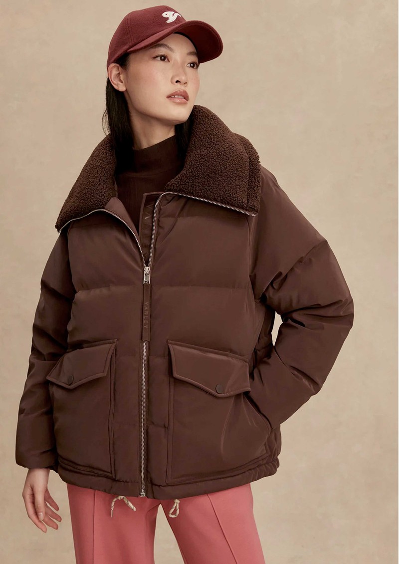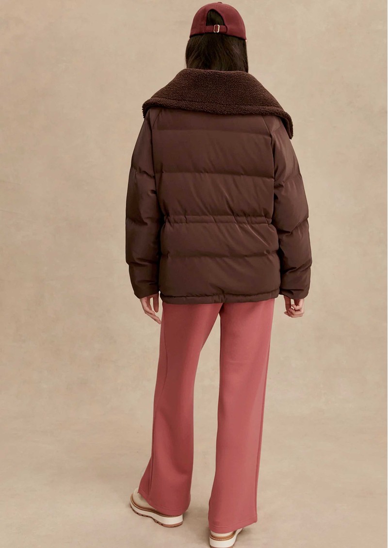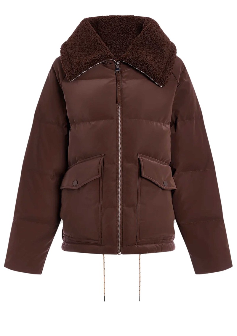 The Varley Roseville Down Jacket in Coffee Bean combines luxurious Nubuck PU with insulating down fill for exceptional warmth. Featuring a boxy, oversized silhouette, a cosy sherpa collar, internal cuffs, patch pockets, and a drawstring hem, it blends contemporary style with practical functionality.