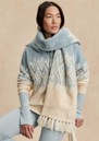 The Varley Sebastian Jacquard Scarf in Glacier Blue adds a stylish finishing touch to any winter outfit. Crafted in a textured bouclé jacquard with playful tassels, it pairs beautifully with any Varley co ord for a coordinated, elegant look. One size.