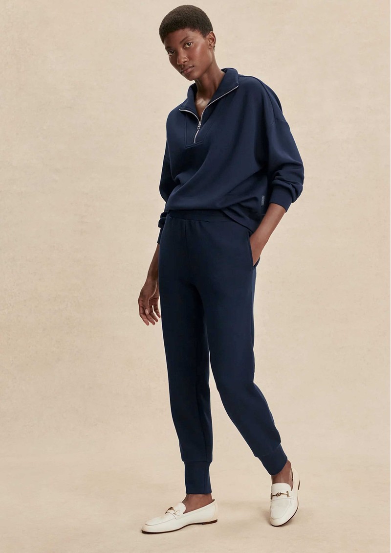 Introducing the Varley Slim Cuff Sweatpant in navy, a stylish and versatile piece you’ll want to wear again and again. Made from Varley’s signature DoubleSoft® fabric, these joggers combine comfort with a tailored, modern silhouette, featuring cuffed legs for a sleek finish.