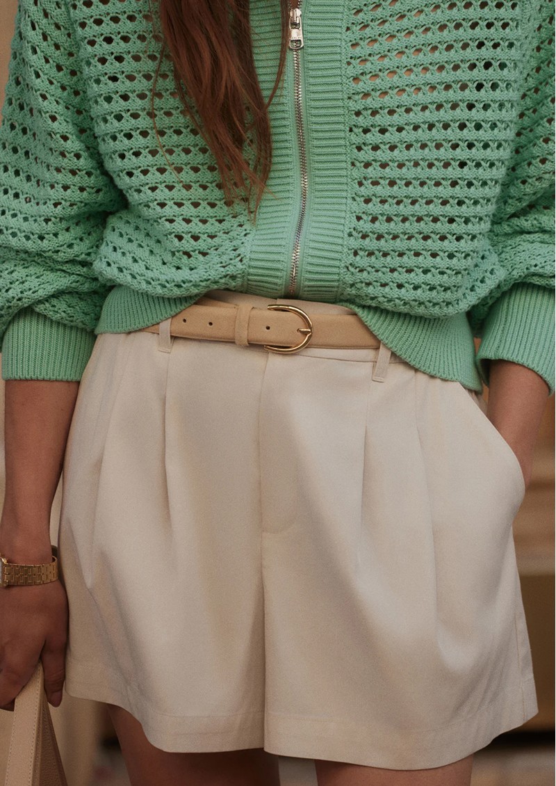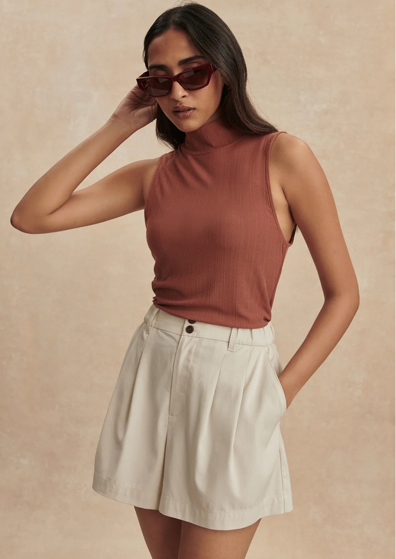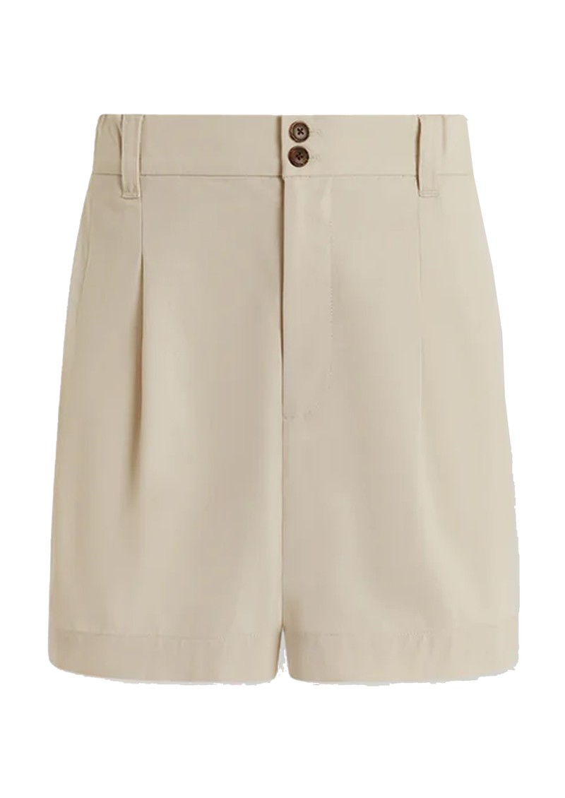 The Varley Tansy Shorts in ivory are crafted from a versatile stretch woven fabric, combining comfort with effortless polish. Designed with front pleats and belt loops, they offer a flattering, adjustable fit perfect for chic summer styling.